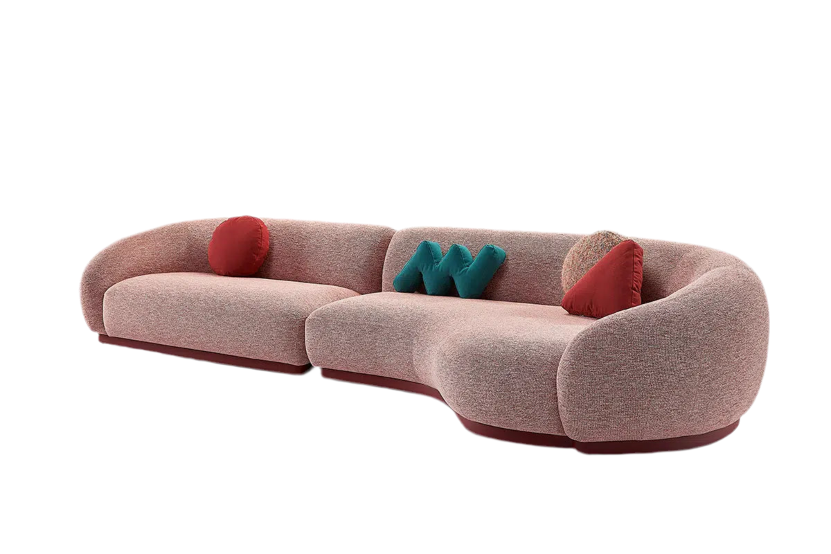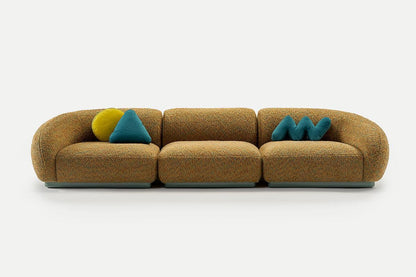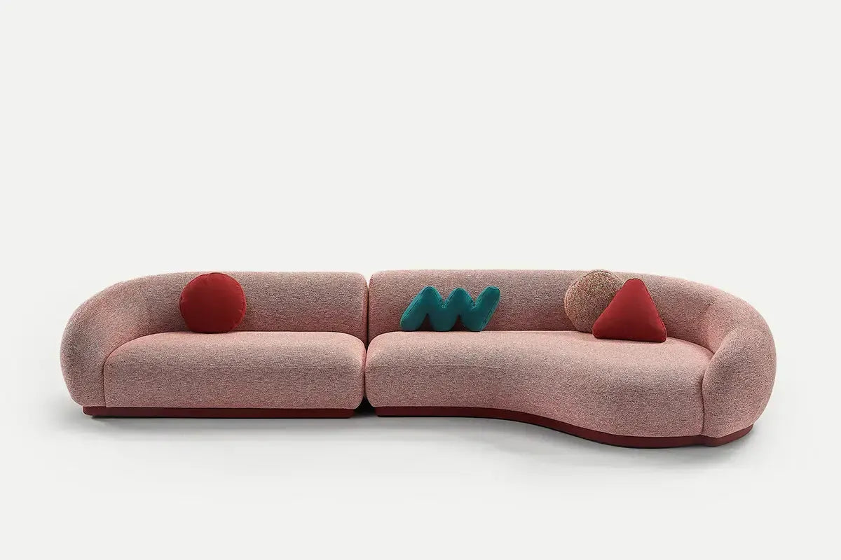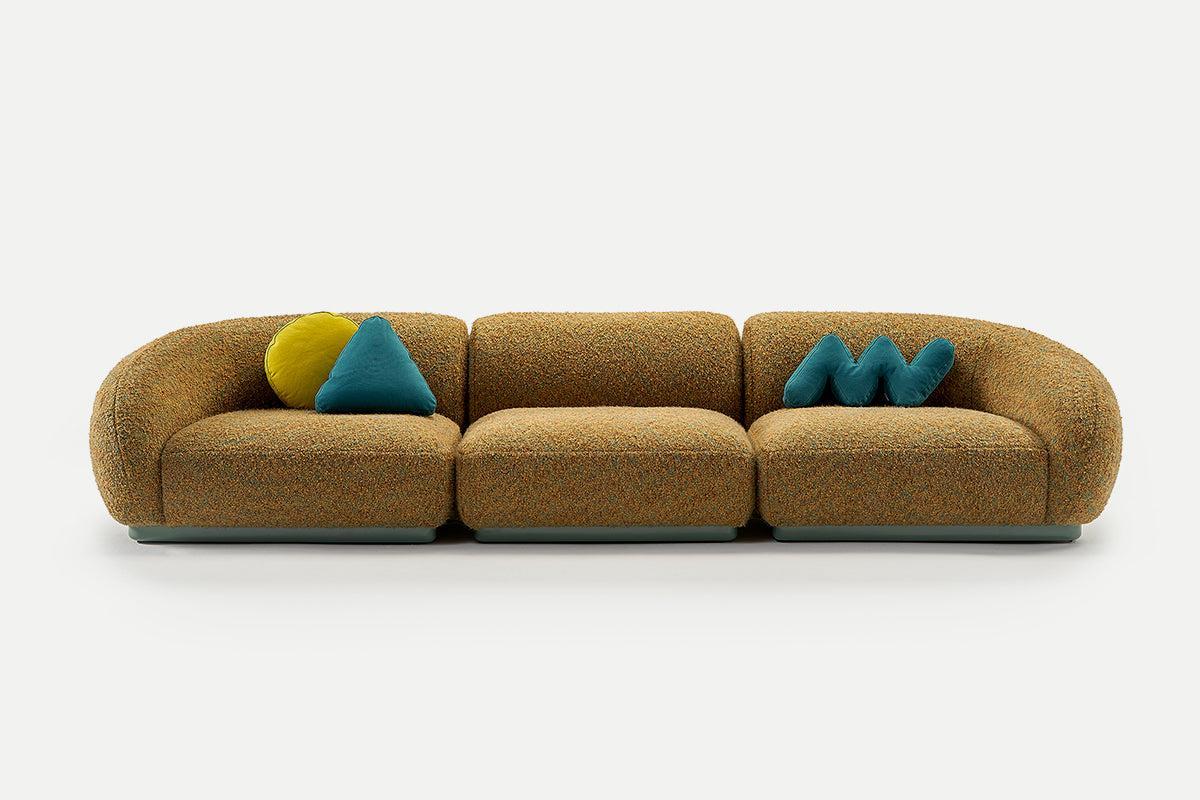 Three whimsically shaped loose cushions—round, triangular, and zigzag